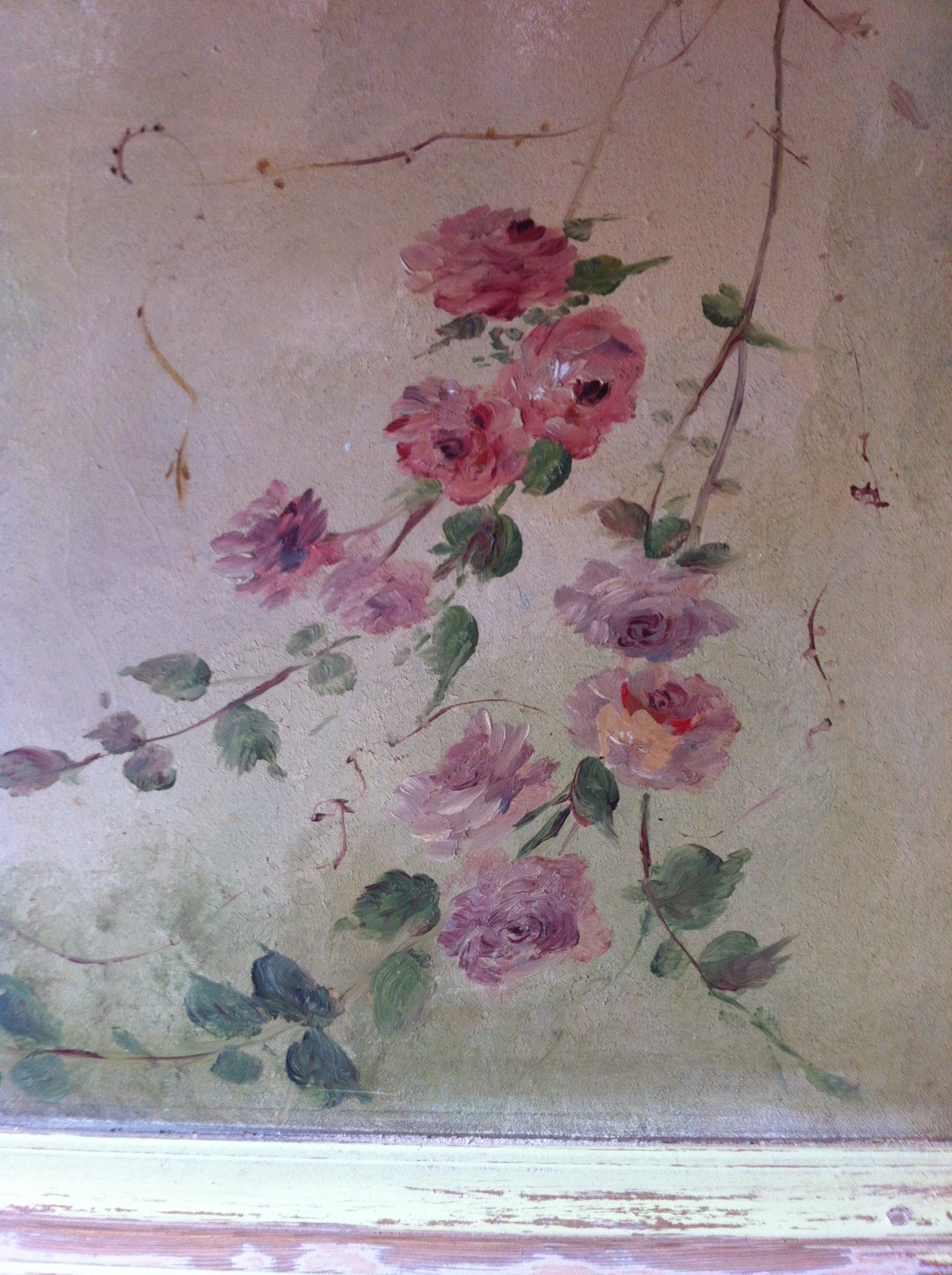 En visitant la maison, on s’aperçoit vite que la menuiserie n’était pas la seule passion de la famille. La peinture faisait partie de leur quotidien également. En effet, dans le couloir de l’entrée on retrouve des roses peintes ici et là. Un paon trône fièrement dans la montée d’escalier. Et quel paon ! Il est Majestueux (avec un M majuscule svp) ! Malheureusement, il est en voix de disparition, les murs défraîchis et fissurés ne nous permettrons pas de le garder en vie (mais nous l’immortaliserons dans un cliché de meilleure qualité, c’est promis).