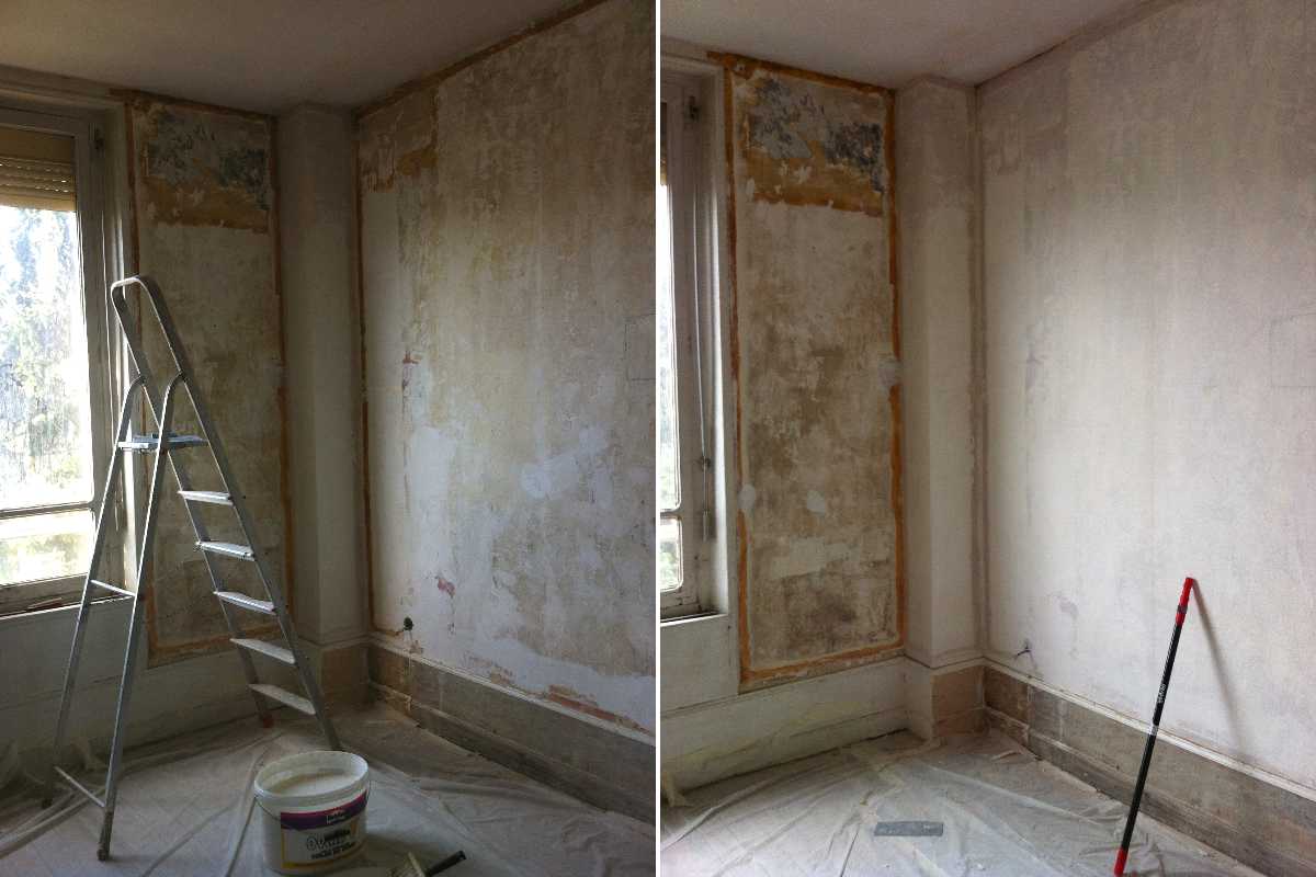 Un petit aperçu de notre future chambre « avant-après ». Le mur de gauche n’est pas recouvert volontairement car nous allons faire changer les fenêtres ainsi que les volets roulants, donc pour ne pas risquer de l’abimer, la pose de la toile se fera après celle des nouvelles fenêtres.