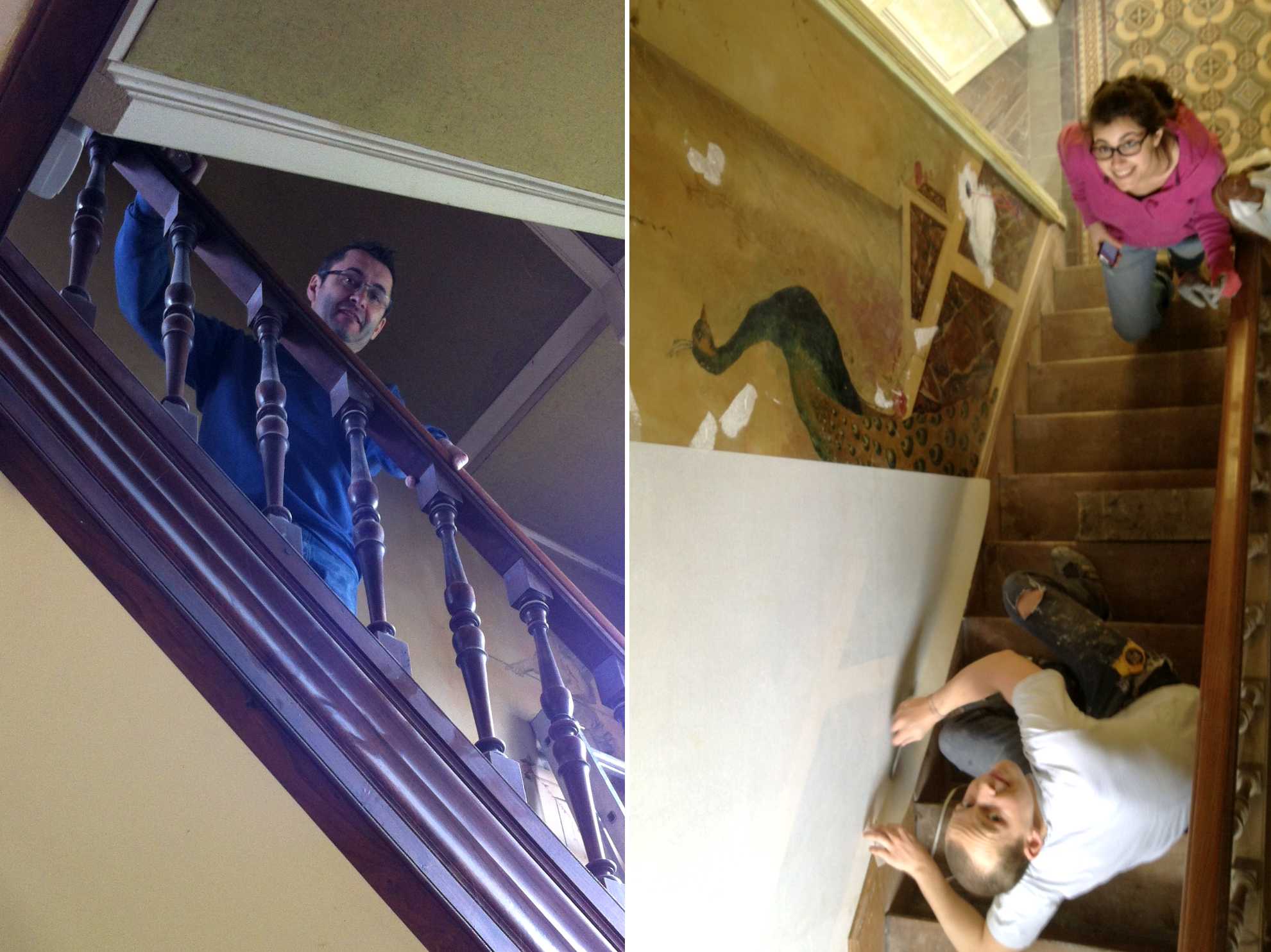 L’escalier et son fameux paon ! (rond et rond petit pata-paon) Nous n’avons pas pu le garder à vue car l’état du mur ne nous le permettait pas (et nos goûts non plus d’ailleurs), il sera donc caché derrière une toile tout comme les fleurs du couloirs et les oiseaux du petit salon.