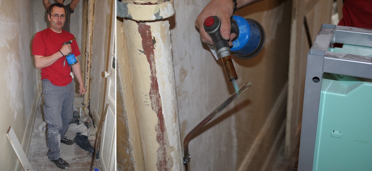 L’alimentation d’eau se faisant par le haut pour les anciennes toilettes, le tuyau d’arrivée d’eau était à la verticale. Il a donc fallu faire chauffer le cuivre pour le mettre à l’horizontale afin qu’il longe la plinthe et ensuite le faire remonter au niveau du réservoir des nouvelles toilettes.