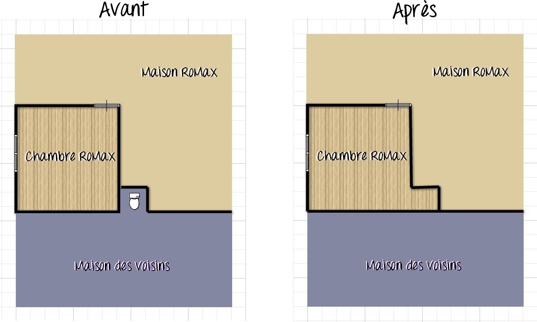 En fait les vendeurs avaient les 2 maisons et les 2 étaient a vendre. Le géomètre a fait des découpes droites. Les voisins qui ont acheté après nous ont du recréer des toilettes 🙂