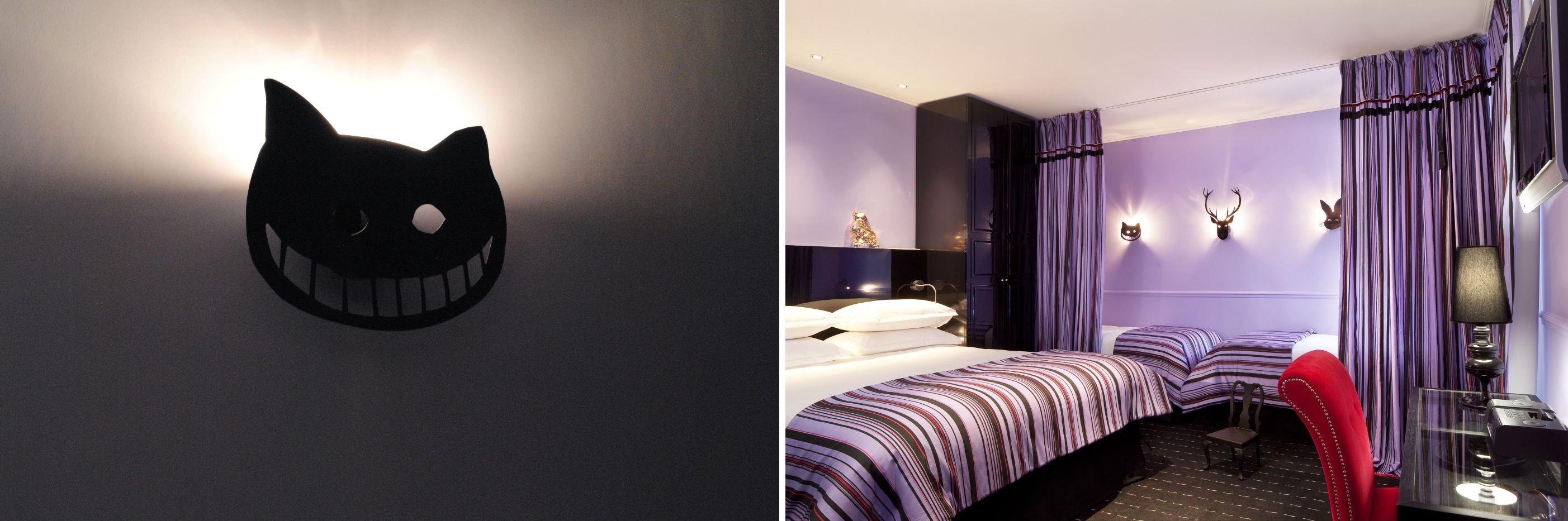 Envouthé Hotel Original - Chambre OrC’est dans le monde d’Alice que nous finirons notre petite visite en nous rendant dans la chambre Aux Merveilles. Le parme et les rayures noires et blanches relevés par quelques touches de rouge (grr la vilaine Reine de Coeur) nous emmènent directement dans l’univers psychédélique du célèbre conte de Lewis Carroll.