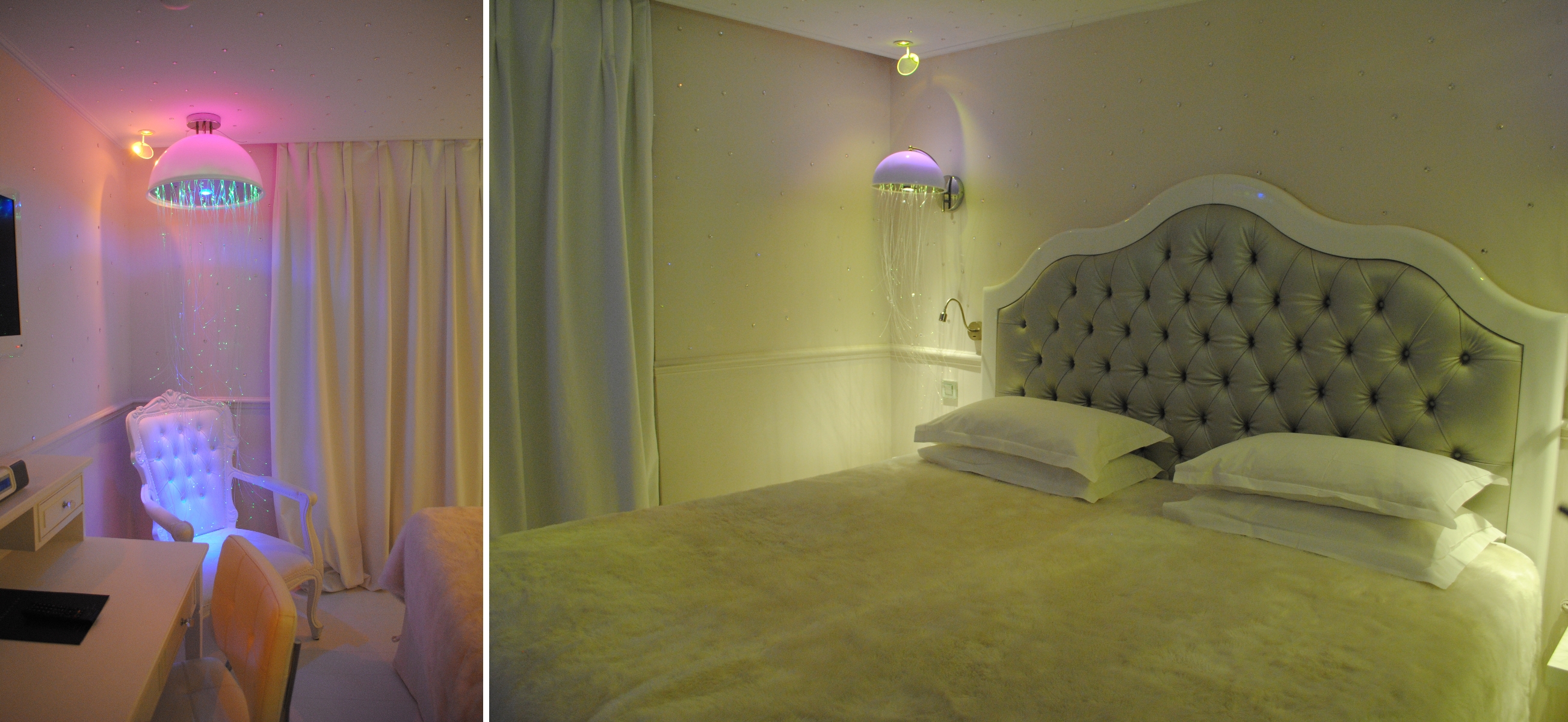 Envouthé Hotel Original - 1La Reine de Cristal, première chambre que nous avons pû visiter (ma préférée), inspirée d’un conte d’Andersen, elle met en opposition le froid de la glace et la chaleur des jeux de lumière. Les Swarovski ornant les murs jouent avec les lumières changeantes et réchauffent ce petit nid douillet recouvert d’une douce fourrure (synthétique, je vous rassure).