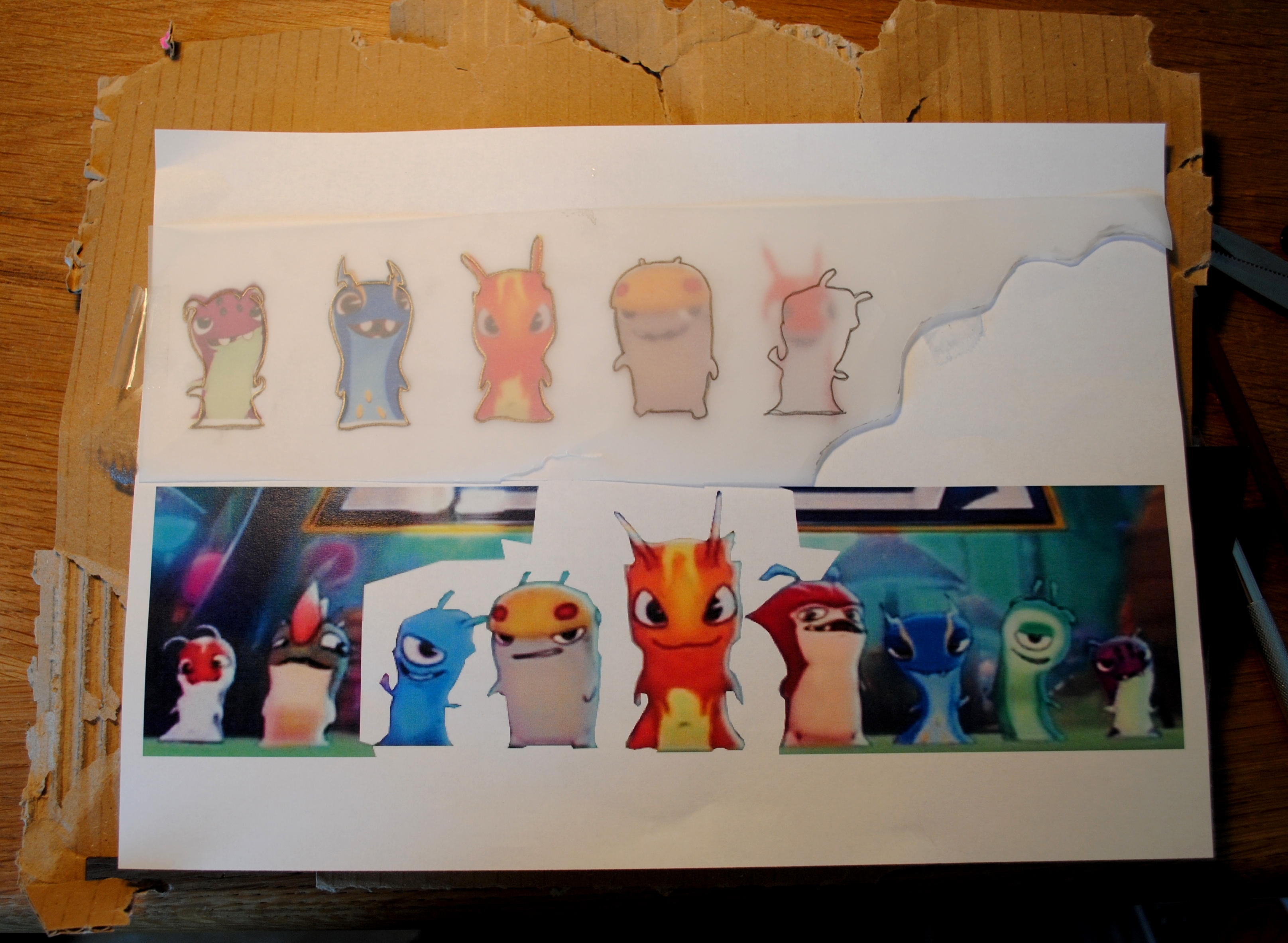 Placez la feuille de calque (pour moi ça sera une chute de papier calque, faudrait pas gâcher ce précieux papier) sur vos petits bonhommes et tracez les contours. N’hésitez pas à mettre un bout de scotch pour ne pas que le calque se déplace et que vos petits monstres soient décalés.