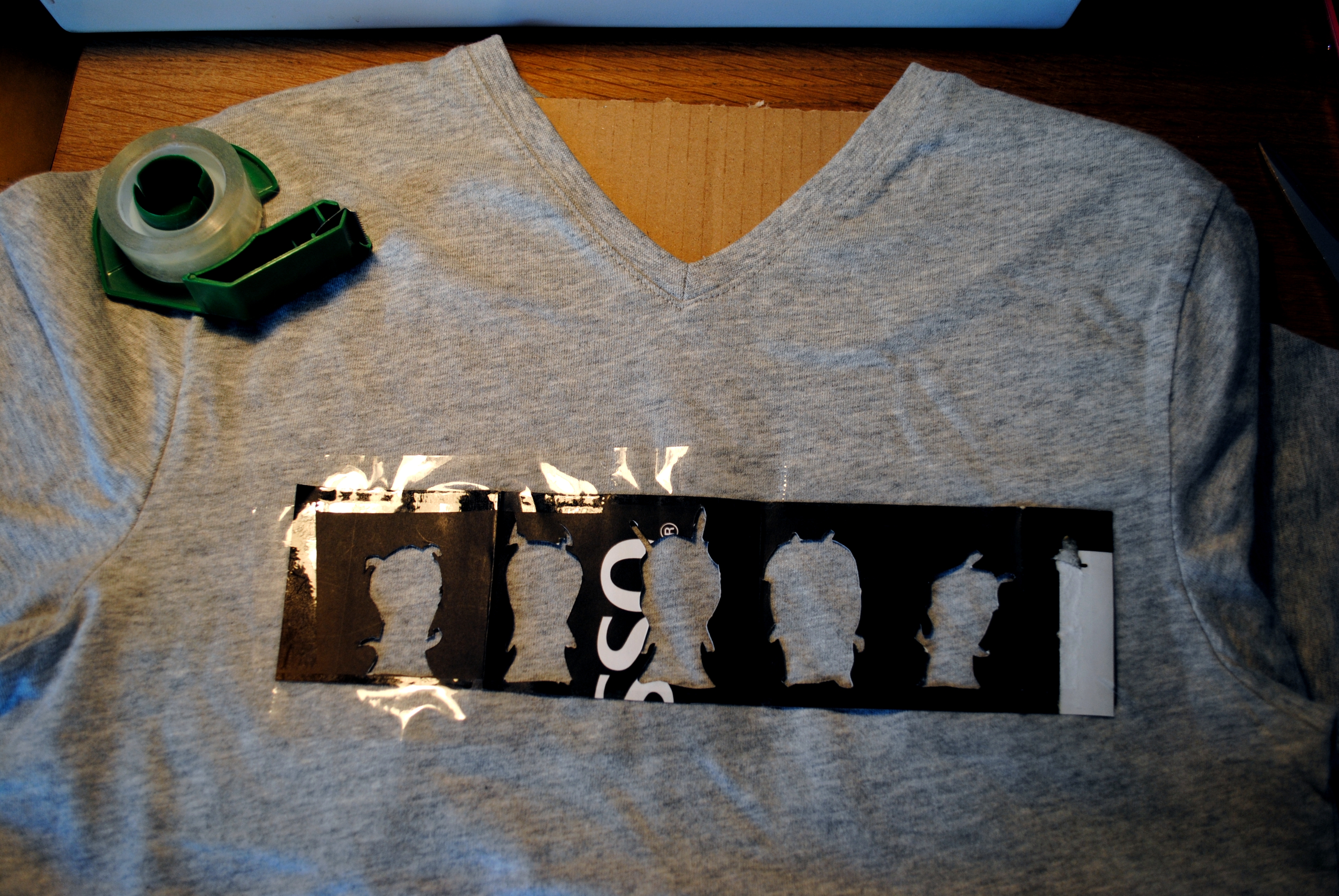 Etape cruciale si vous ne voulez pas que la peinture dégouline partout ou que vos personnages ne se retrouvent pas alignés… On scotche, en haut, en bas, à droite, à gauche (ces soirée là, oh, oh,… pardon pour la référence aux 90’s et à Yannick avec sa reprise de folie). On ne lésine donc pas sur le scotch, il faut que le pochoir soit bien à plat et qu’il ne bouge pas.