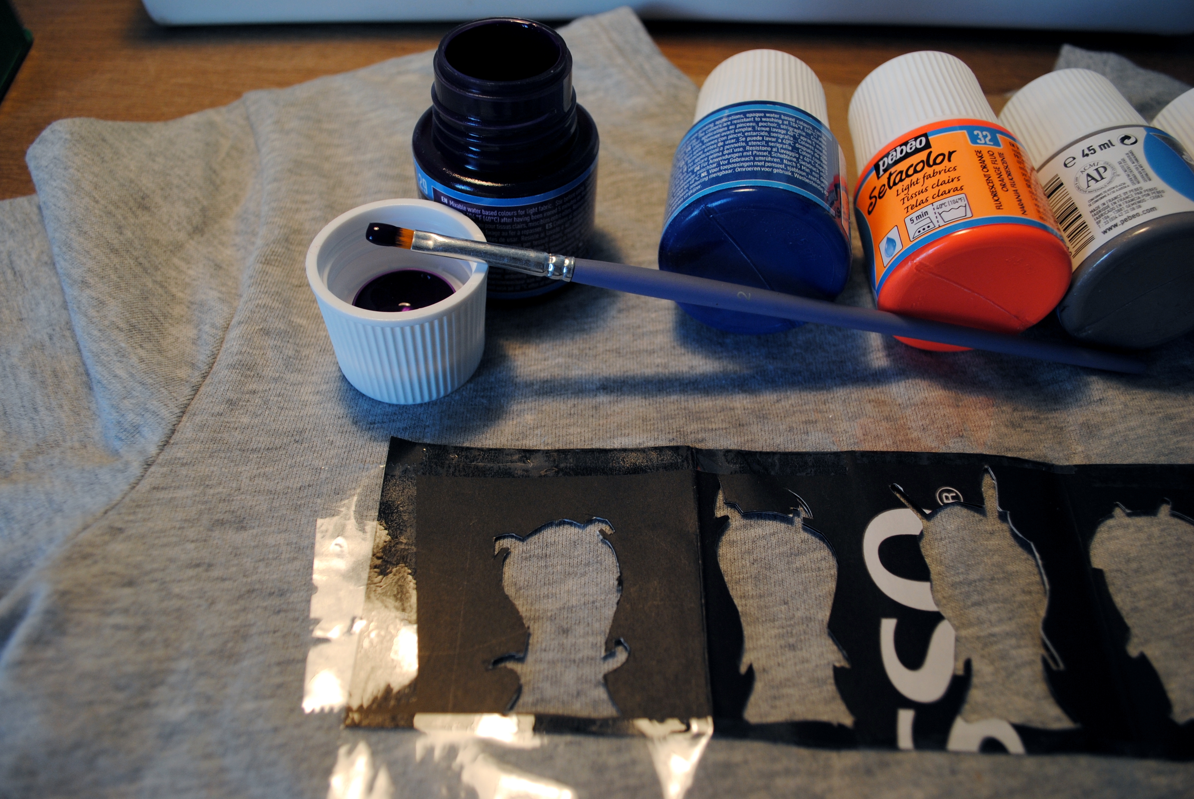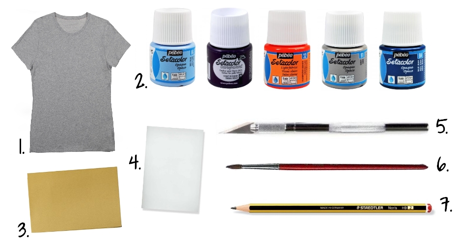 1. t-shirt gris – 2. 5 peintures Setacolor Pebeo3. papier cartonné – 4. papier calque5. cutter de précision5. pinceau fin – 7. crayon de papier