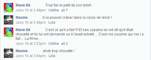 Avant de l’enfiler, on n’oublie pas de fixer la peinture au fer à repasser pendant 2 min. Et hop c’est parti pour la cours de récré ! Et même que ses copains l’ont trop jalousé et qu’il était trop fier de dire que c’était sa cousine qui lui avait fait ! Si, si c’est vrai, regardez :
