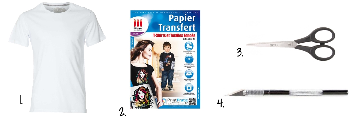 1. t-shirt blanc – 2. papier transfert – 3. ciseaux – 4. cutter de précision