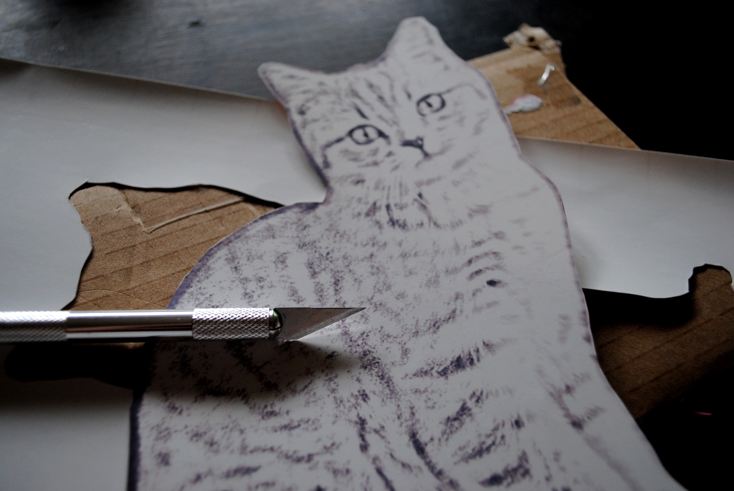 A l’aide de mon cutter de précision, je viens découper le pourtour de Strady. Je n’oublie pas de placer un carton sous ma feuille pour ne pas rayer tout ce qui traîne en dessous.