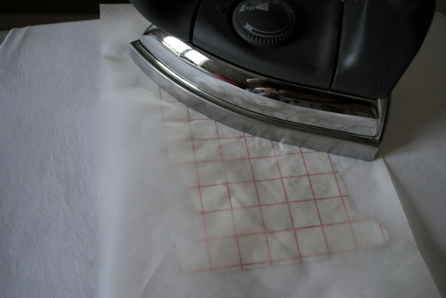 Je place la feuille de papier sulfurisé sur le papier transfert et je viens repasser en appuyant fermement pendant 1 minute. Bien sur je retire les scotch au fur et à mesure que je repasse pour ne pas qu’ils fondent sur le t-shirt.