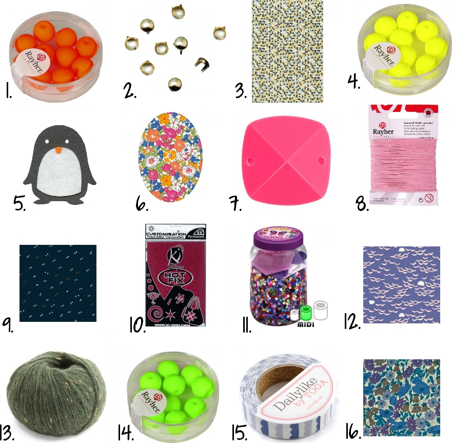 1. Perles en verres orange fluo – 2. Clous à griffes – 3. Thermocollan Dailylike – 4. Perles en verre jaune fluo – 5. Pingouin feutrine thermocollant – 6. Coudières thermocollant Liberty – 7. Pierre à coudre – 8. Cordon coton ciré rose – 9. Tissu Atelier Brunette Graphik Sparkle – 10. Thermocollant pailleté Ki Sign – 11. Perles Hama – 12. Tissu Atelier Brunette – 13. Laine métal chic marquise – 14. Perles en verre vert fluo – 15. Masking tape Dailylike – 16. Tissu Liberty Poppy Daisy