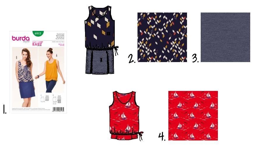 1. Patron Burda – 2. Tissu Atelier Brunette Graphik – 3. Tissu France Duval Stalla – 4. Tissu Atelier Brunette Mandirac