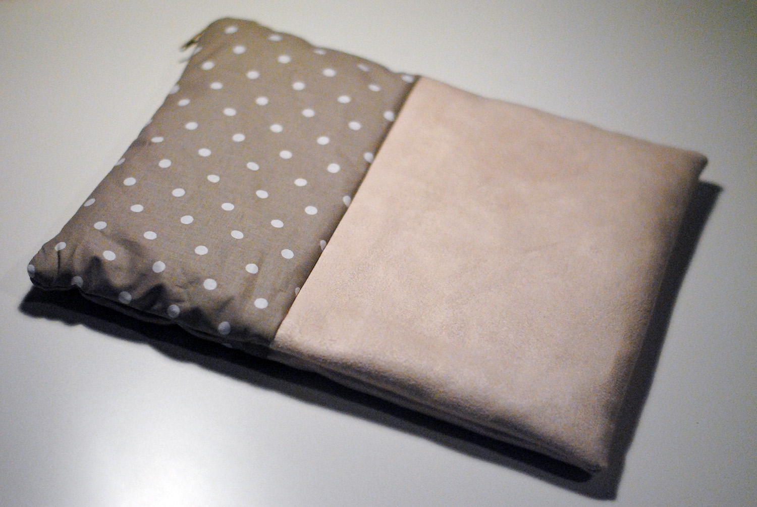 1. Suédine – 2. Tissu à pois – 3. Ouate en rouleau – 4. Zip – 5. Fil à coudre – 6. Aiguille (ou mac) – 7. Ciseaux