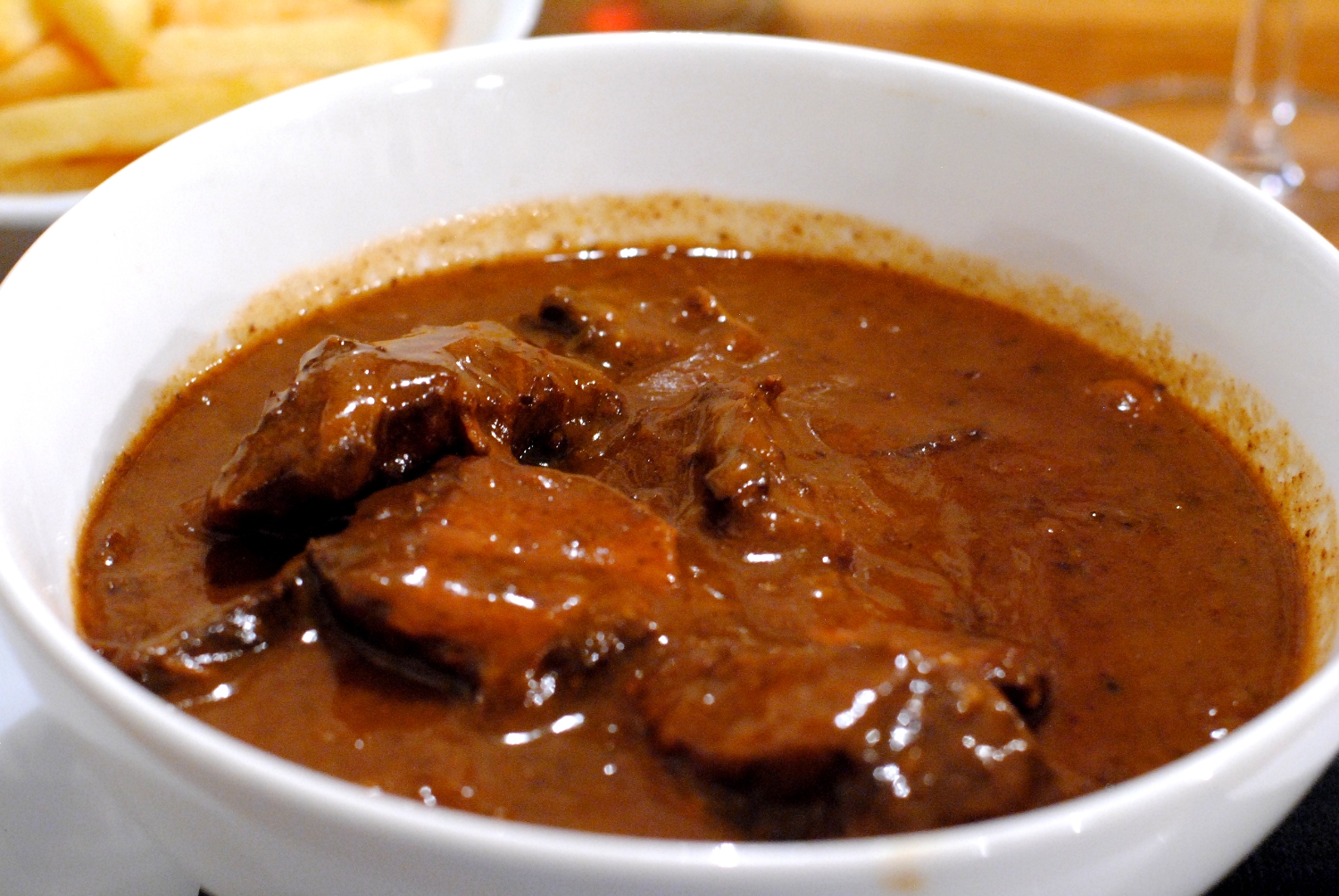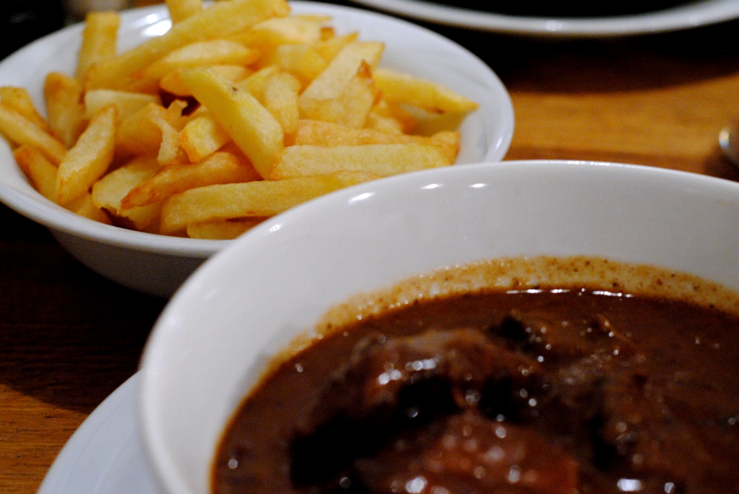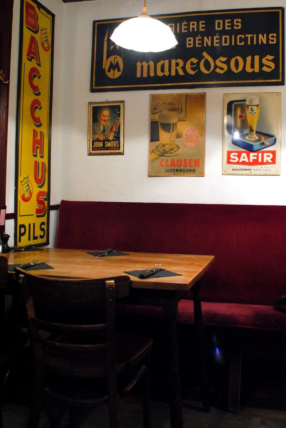 Lors de notre dernière visite à Bruxelles, en février dernier, nous étions tombés nez à nez avec cette jolie vitrine de restaurant qui nous avait fortement donné envie. Malheureusement sans réservation, impossible de dîner avant 21h… (après 21h plus de réservation, c’est au petit bonheur la chance…) Ne voulant pas réitérer l’expérience, nous avions cette fois-ci pensé à réserver notre place… Un accueil plutôt sympathique à l’arrivée, on nous installe dans le fond de la salle (proche de la porte des wc… ça commençait bien, mais il faut optimiser la petite salle alors…). Un premier passage pour l’apéritif, un second pour la commande et puis… au bout de 45 min un dernier pour nous apporter les plats. Bien qu’ils aient mis le temps pour préparer nos 2 carbonnades, les frites n’étaient pas excellentes, cependant la viande et sa sauce étaient bonnes, je n’ai pas été déçue concernant le contenu de mon assiette bien remplie. Cela ne vaut pas bien sur la carbonnade du Bugatti, mais tout de même elle se laisse manger 😉 Je recommande les Brassins surtout pour l’ambiance petit restaurant de quartier, situé dans la rue où est née Audrey Hepburn 😉