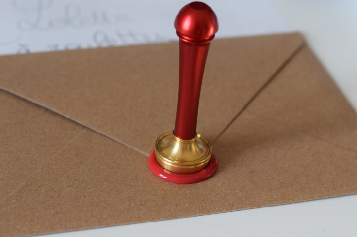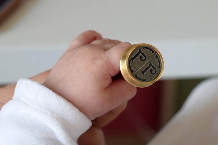 Pour la couleur de la cire, nous avons choisi le pourpre, encore un classique, mais quoi de plus chic ! J’ai bien essayé de faire le cachet de quelques enveloppe accompagnée de Lola, mais je me suis vite faite chiper la place par le papa qui devait trouver l’exercice relaxant… Voyons le côté positif, cela m’a permis de prendre les photos.