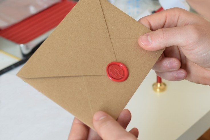 En tout cas, je suis vraiment contente du rendu final du faire-part, et ce qui est drôle quand on cachette l’enveloppe, c’est que les personnes qui le reçoivent, n’osent pas l’ouvrir car ils ne veulent abîmer ni l’enveloppe, ni le cachet. Et à tous les coups ça fonctionne « oh non mais comment je vais faire pour l’ouvrir, je ne veux pas tout arracher ! ». Alors si vous aussi, vous voulez faire des blagues, à vos pistolets !