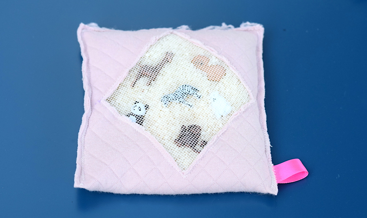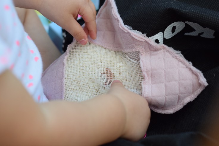 Le Spy game c’est un petit sac fermé avec un empiècement transparent pour voir ce qu’il y a dedans. À l’intérieur, j’ai mis du riz et des petits boutons Récréatys en forme d’animaux pour l’un et sur le thème de la plage pour l’autre. Voici la version avec les animaux avec le bébé curieux qui cherche à comprendre ce que c’est.