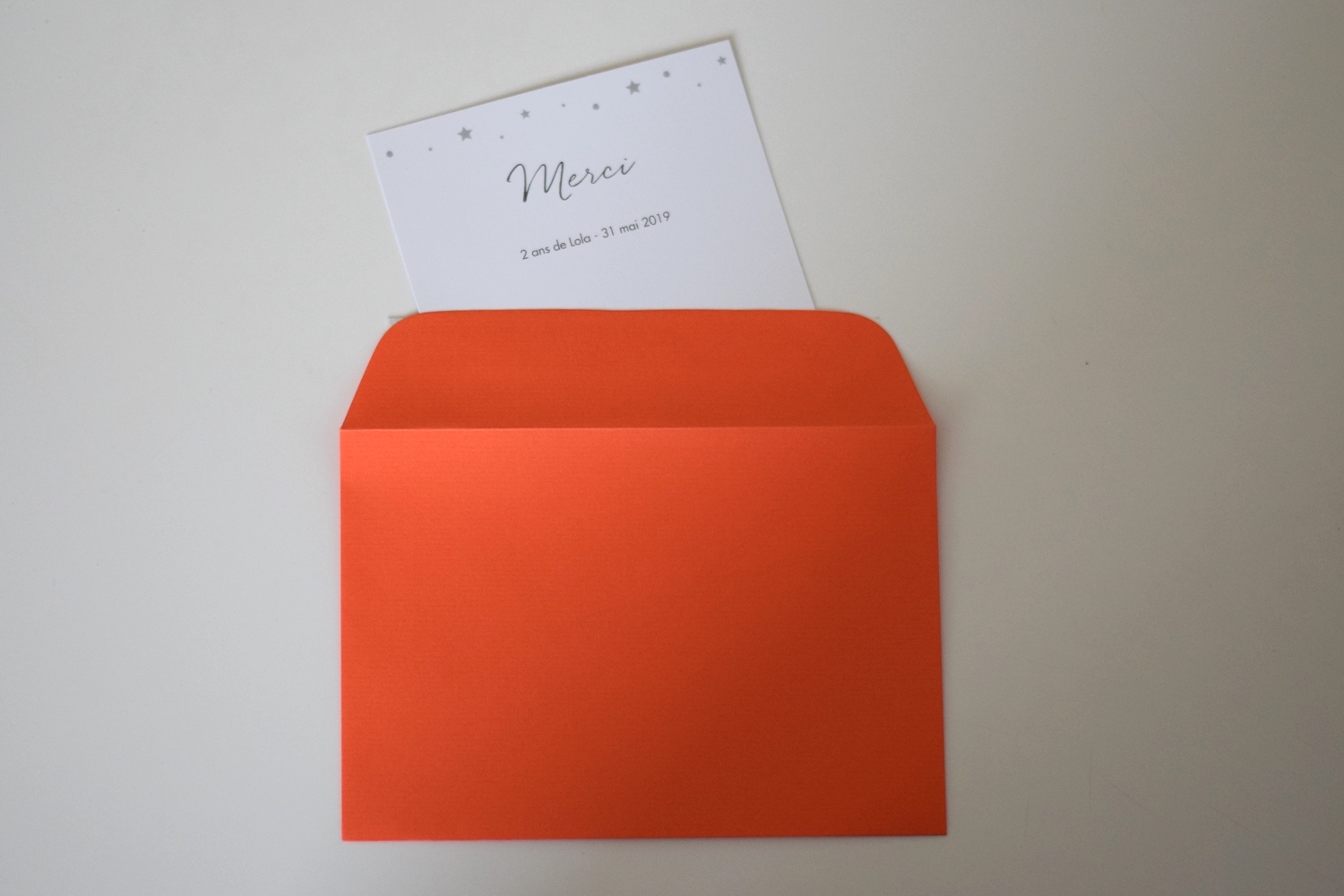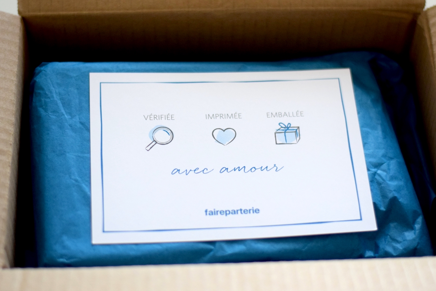 Le colis est arrivé rapidement et la qualité est vraiment au rendez-vous de A à Z. Les cartes et enveloppes sont emballées soigneusement dans du papier de soie. Le papier utilisé est vraiment de bonne qualité. On peut également choisir la couleur de ses enveloppes parmi un large choix. Nous avons pris corail.