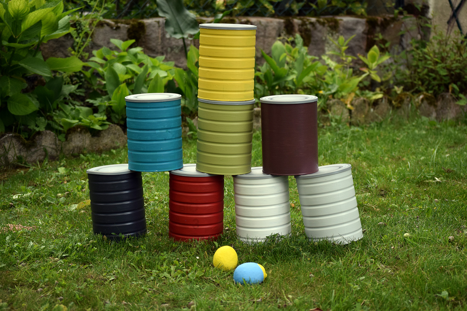 Ensuite, dans ma grande tendance « zéro déchet », j’ai réutilisé des boîtes de lait pour faire un chamboule tout. Pour réaliser les balles, j’ai pris des ballons, que j’ai rempli de riz. Après le chamboule tout, elles serviront de balles anti-stress au papa 😂