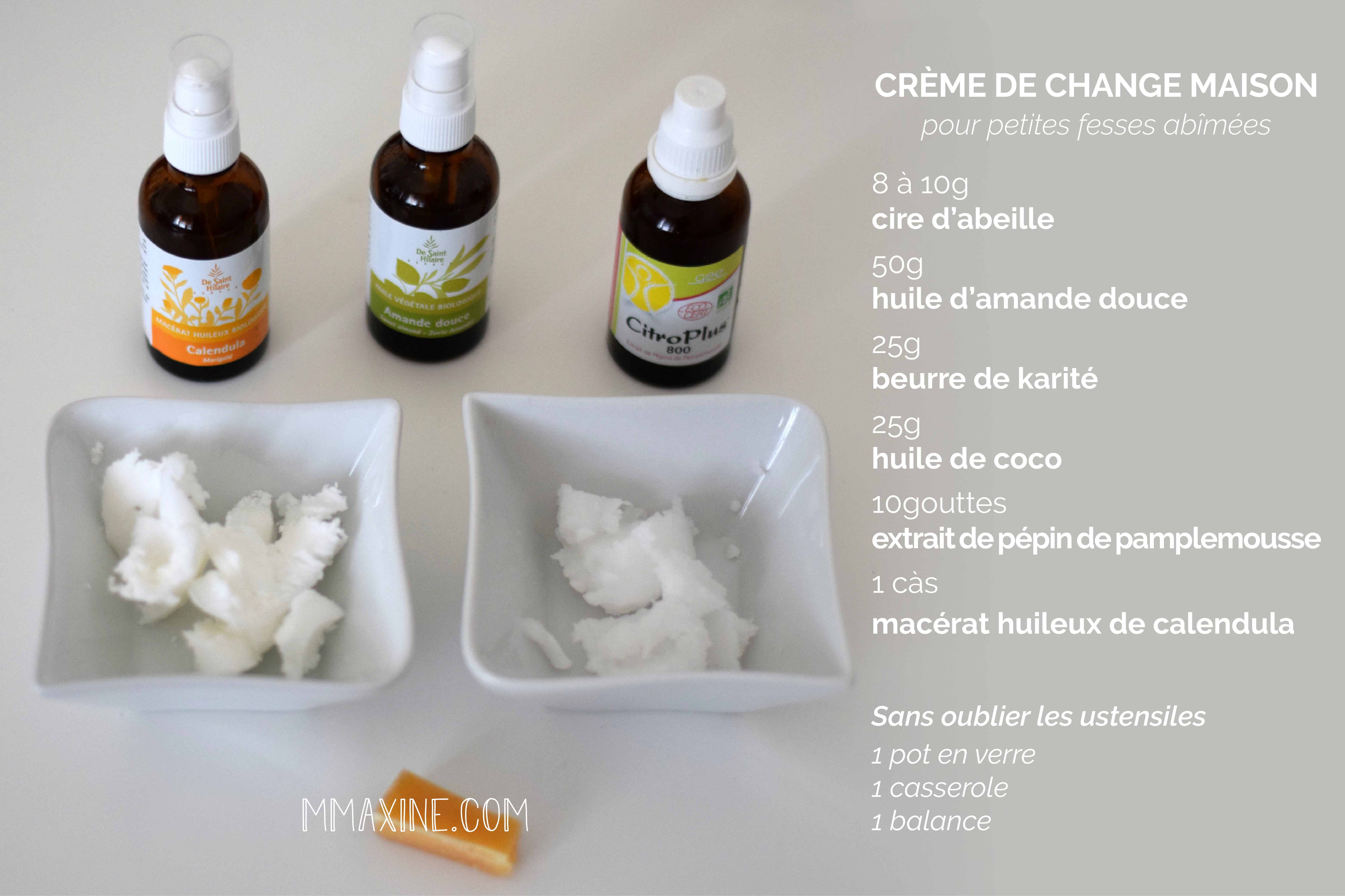J’ai bien testé plusieurs marques de crème de change, mais je n’aimais pas leur application, je les trouvais épaisses, lourdes, et la plupart du temps elles « n’accrochaient » pas à la peau si celle-ci était grasse (à cause du liniment par exemple). De plus, quand on lit la longue liste des ingrédients, on ne comprends pas grand chose (ah si « aqua » !)… bref ces crèmes contiennent trop de composants être neutres et sans danger. Même si les enquêtes sur les produits bébé nous aiguillent vers les « moins pires » (je reste cependant dubitative sur le fait que les marques ne payent pas pour paraître en haut du classement) ; j’ai décidé, comme pour l’eau nettoyante, de faire ma crème de change maison.