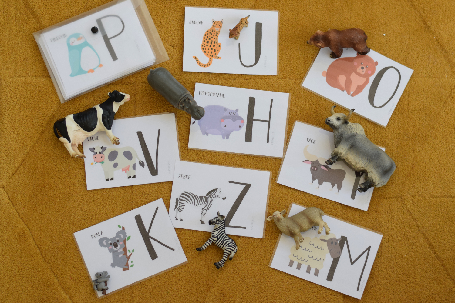 Lorsque l’on joue avec l’alphabet, j’aime bien faire chercher à Lola les animaux de l’abécédaire qu’elle a dans ses jouets. Vu les collections Schleich et Playmobil que nous avons, on a de quoi s’occuper…