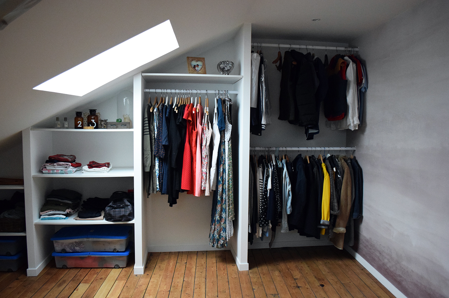 Passons à la structure du dressing sous-pente. Qui n’a jamais rêvé du dressing de Carrie Bradshaw ou de celui de Blair Waldorf ? Loin d’avoir le même nombre de pièces à y ranger, mais quand on le rempli à deux finalement ça va assez vite. J’avais donc quelques spécificités techniques à prendre en compte notamment 3 tringles pour suspendre les vêtements : 2 tringles « basses » (chemises, manteaux, top…) et une tringle grande hauteur pour y suspendre mes robes ou autres pièces longues.