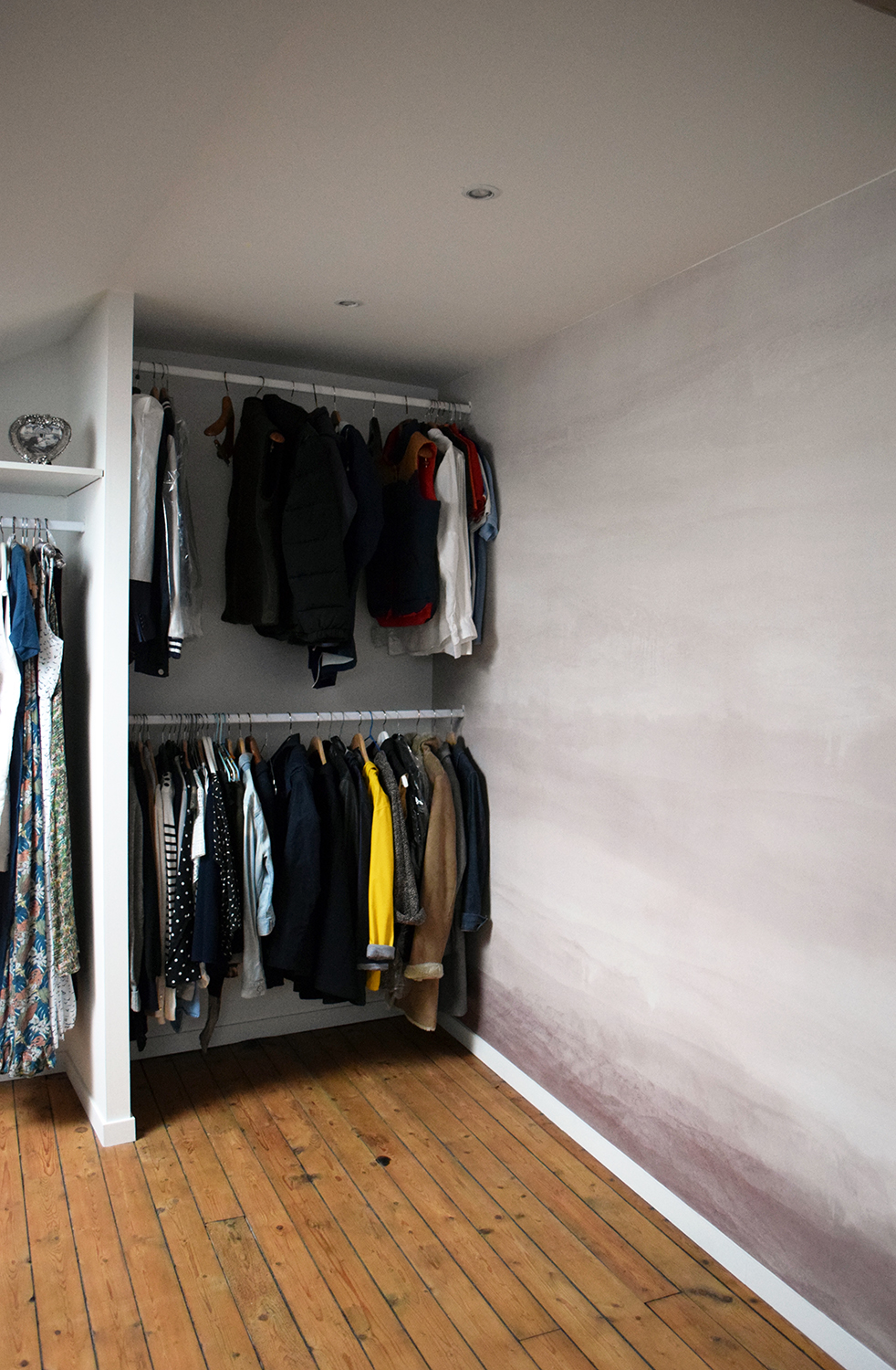 Une fois la peinture faite et le papier-peint posé, nous avons finalisé le dressing sous-pente en y ajoutant les tringles et les étagères. Ne restait plus qu’à vider les nombreux cartons que nous avions encore depuis le déménagement et à remplir ce beau dressing. Je m’arrête ici pour la narration, je vous laisse admirer le travail de mon chef de chantier préféré.