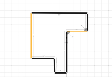 Nous avons alors opté pour une troisième option pour différencier les espaces : le papier-peint. Je vois vos yeux grands ouverts. Nous avons choisi 2 papiers peints différents qui je vous rassure, s’accordent bien ensemble (même si à priori quand on en regarde un, on ne voit pas l’autre). Les deux murs indiqués en jaune sur le schéma suivant étant ceux à couvrir de papier. Le plus petit est situé dans le dressing, et l’autre dans l’espace chambre d’amis / bureau.