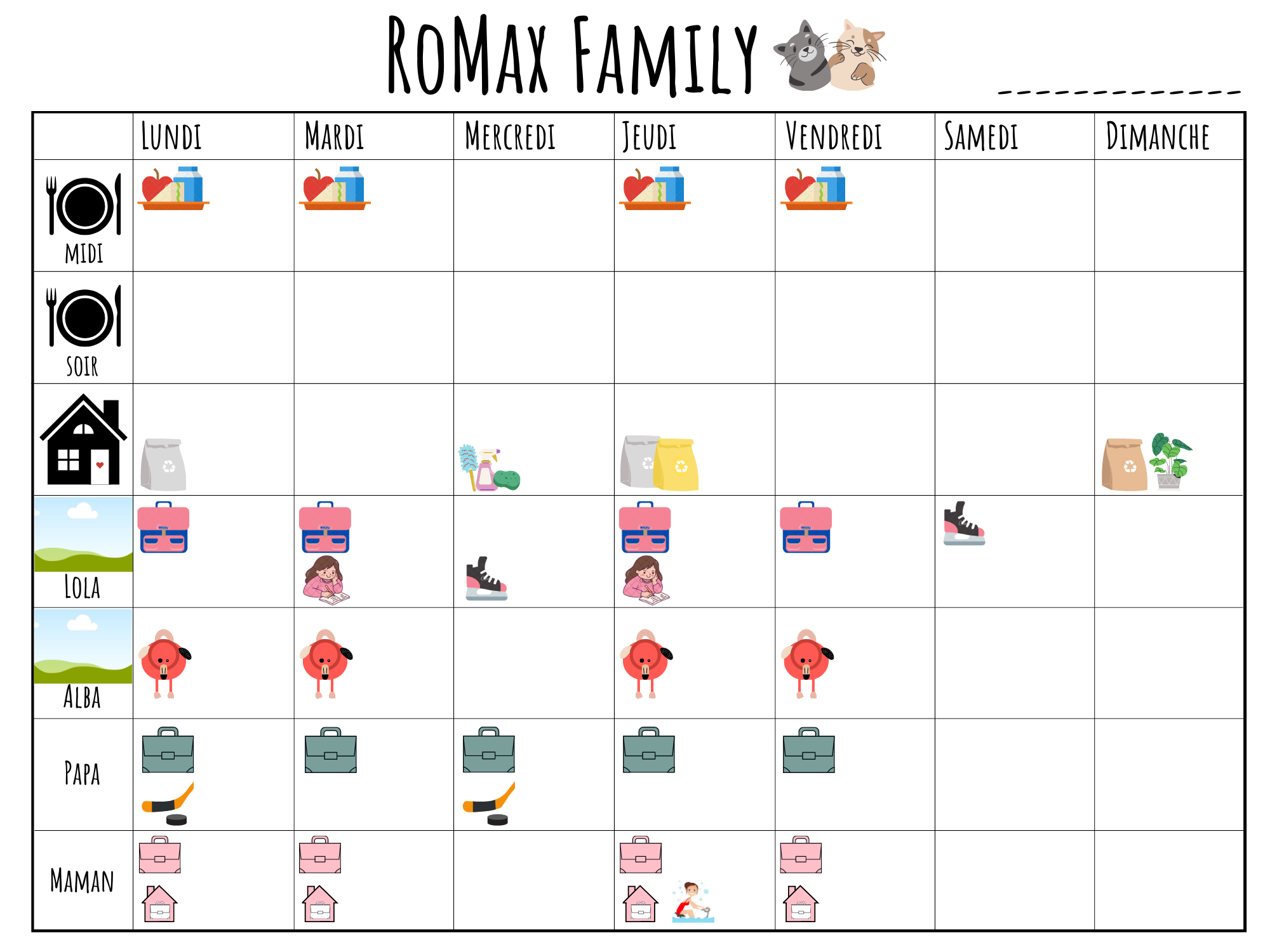 Une ligne par enfant ! J’ai symbolisé l’école par le cartable de chacune de mes filles pour qu’elles s’identifient rapidement. La nouveauté cette année, j’ai ajouté l’étude symbolisée par une fille qui travaille. On peut tout identifier en fonction du planning de l’enfant : nounou, crèche, activités sportive, …